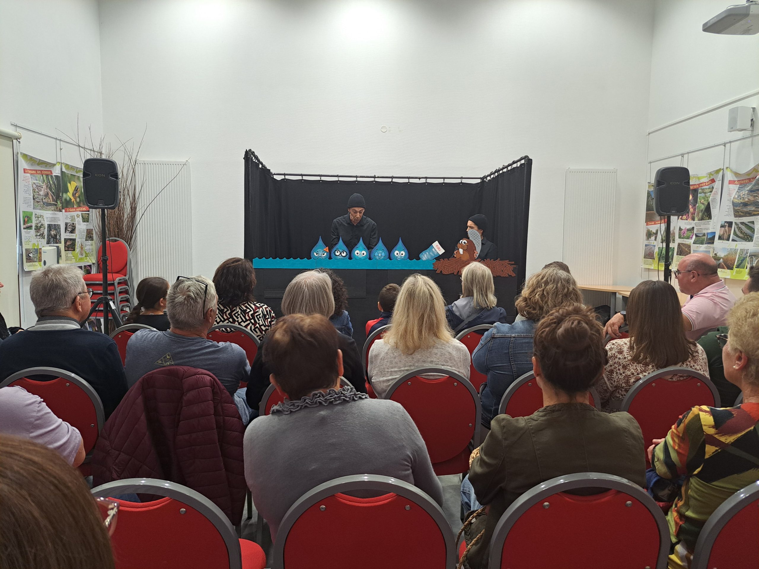 Le samedi après-midi, la Compagnie L’escargot dans les orties a invité les spectateurs au spectacle « Une Vie de Goutte » – De et par Natacha Dellis et Jean-Michel Lété. D’abord dans les nuages avec une bande de gouttes, le public les a ensuite suivies pour le grand saut, une mission périlleuse, les dangers sont nombreux et les activités humaines mettent notre petite équipe à rude épreuve : sécheresses, inondations, pollutions… Au travers de ce voyage, pas moins de 40 visiteurs ont pu prendre conscience de la valeur de la ressource en eau et de l’importance de la préserver.