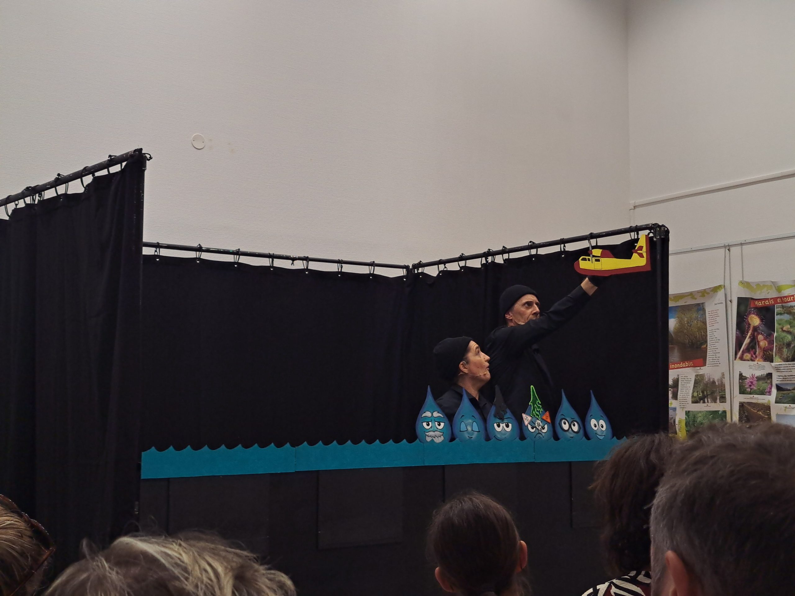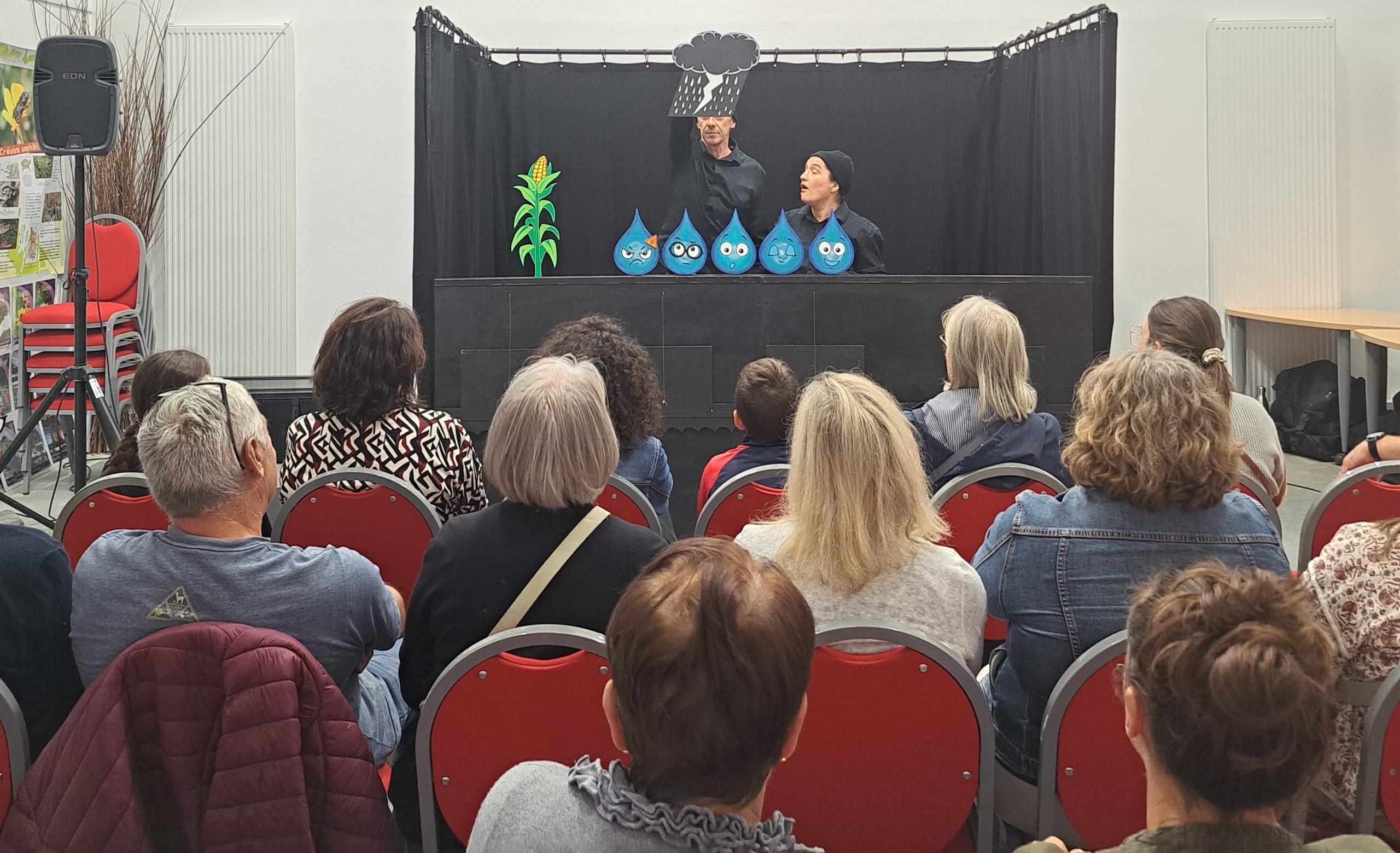 Le samedi après-midi, la Compagnie L’escargot dans les orties a invité les spectateurs au spectacle « Une Vie de Goutte » – De et par Natacha Dellis et Jean-Michel Lété. D’abord dans les nuages avec une bande de gouttes, le public les a ensuite suivies pour le grand saut, une mission périlleuse, les dangers sont nombreux et les activités humaines mettent notre petite équipe à rude épreuve : sécheresses, inondations, pollutions… Au travers de ce voyage, pas moins de 40 visiteurs ont pu prendre conscience de la valeur de la ressource en eau et de l’importance de la préserver.