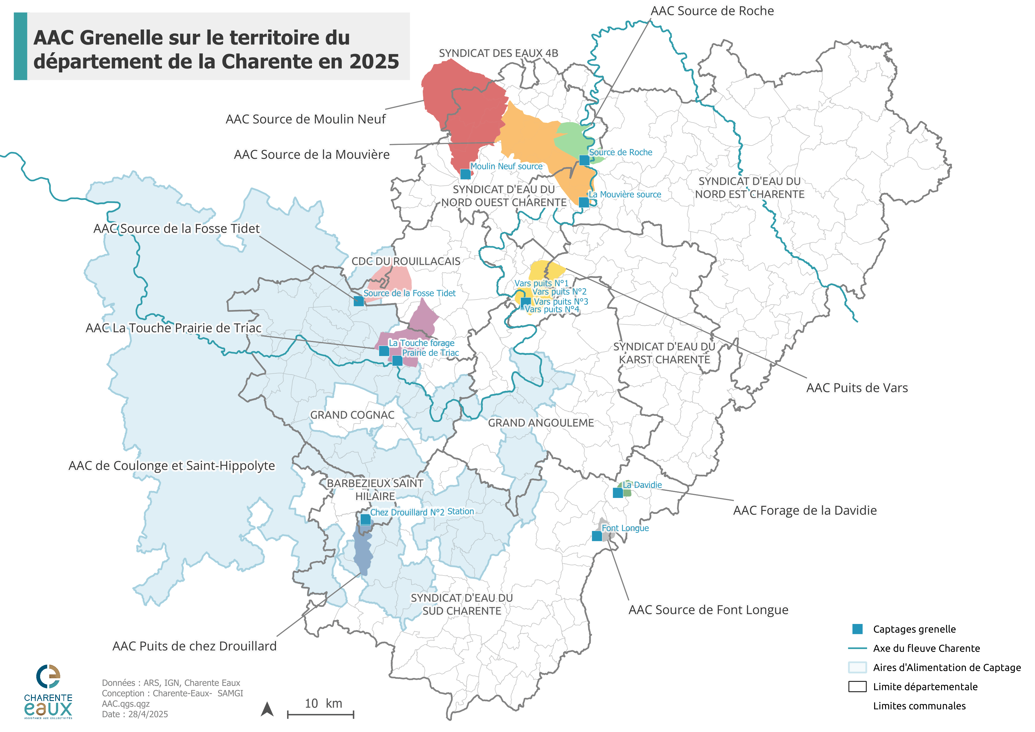 Faisant suite au classement de la Source de Moulin Neuf en tant que captage « prioritaire », la démarche Re-Sources a été initiée en 2002 par le SIAEP de la région de Saint-Fraigne et conduite au travers de deux contrats. Cette AAC a fait partie des 15 territoires pilotes à l’échelle de l’ex région Poitou-Charentes. La Source de Moulin Neuf a ainsi pu bénéficier de deux contrats Re-Sources de 5 ans entre 2008 et 2012 et entre 2014 et 2018. Quant à la source de Roche et au Puits de Vars, la démarche Re-Sources a été initié en 2010 suite au classement des sources en tant que captages « prioritaires ». La source de Roche et les Puits de Vars ont quant à eux bénéficier d’un premier contrat Re-Sources de 5 ans entre 2013 et 2017. Pour la source de Roche, la démarche a été initiée par le SIAEP Val de Roche. Concernant les Puits de Vars, la démarche a été mise en place par le SIAEP de la région de Champniers. Depuis le 1er janvier 2017, cette démarche sur les 3 AAC est conduite par le SIAEP Nord-Ouest Charente.